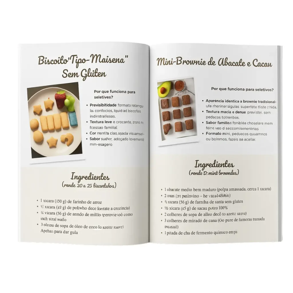 Mais de 100 receitas de lanches nutritivos, desenvolvidas especialmente para o paladar e as necessidades sensoriais de crianças com TEA, principalmente aquelas com seletividade e restrições alimentares.